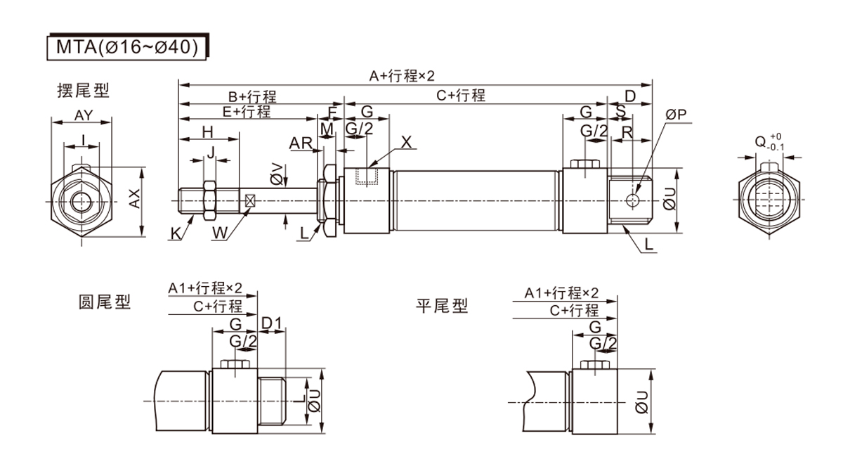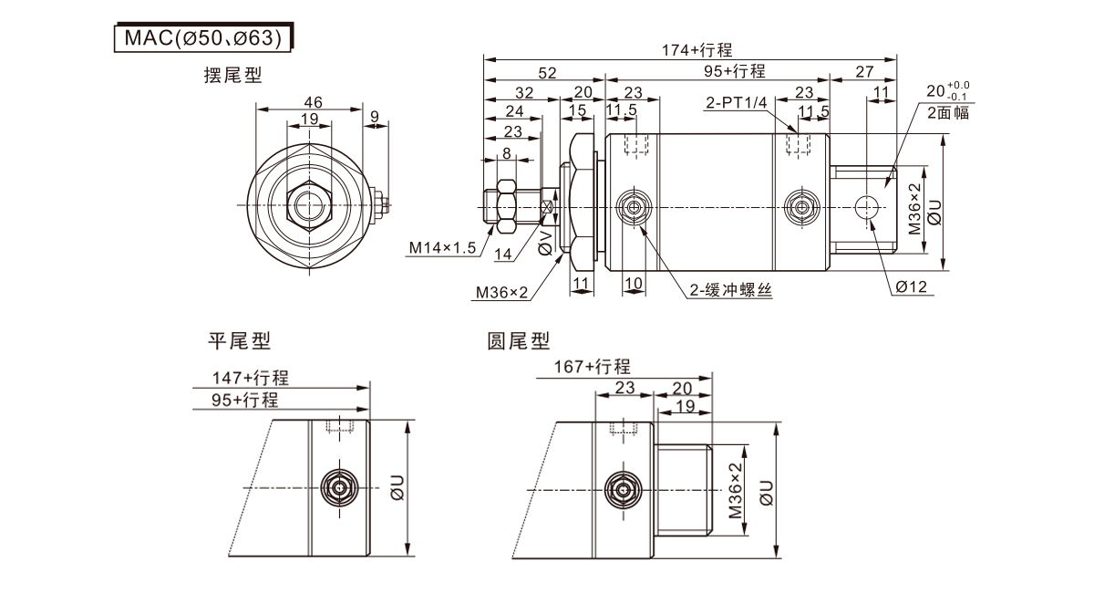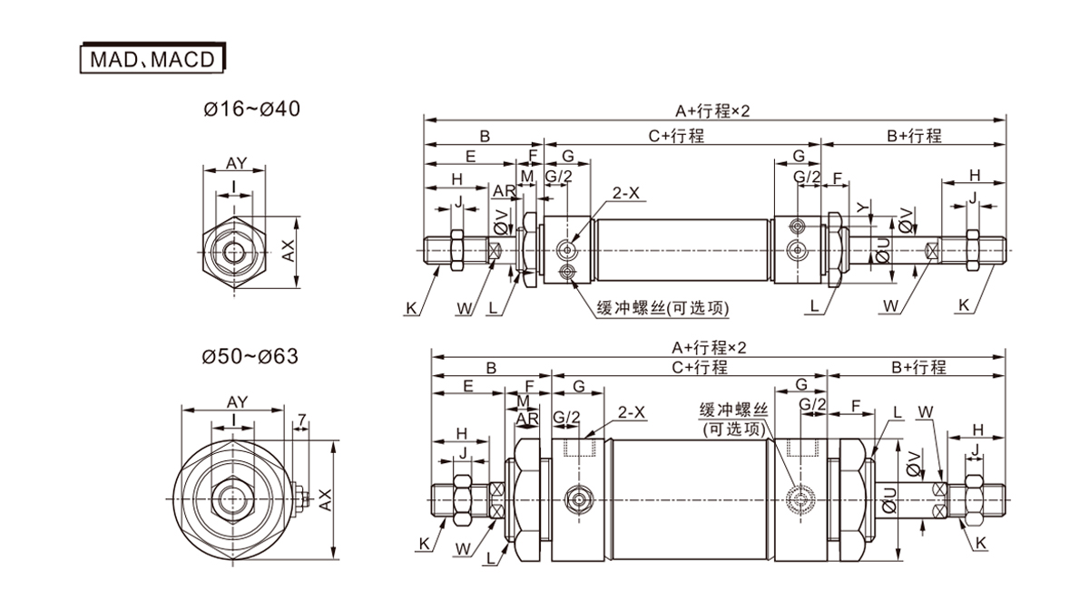 2. 前后盖带固定式防撞垫,可减少气缸的换向冲击;