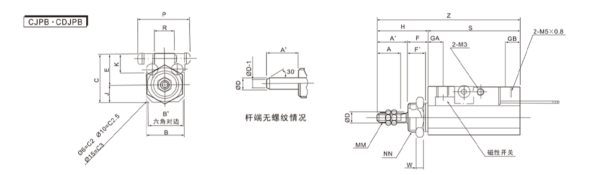 CDJPB系列双作用针型气缸为精密气动执行单元,专为空间受限场景设计,通过紧凑化结构实现高效直线往复运动,适用于高集成度自动化系列。