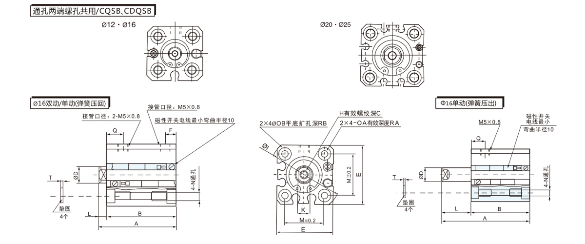 气缸本体集成多维度磁性开关安装接口。其中小缸径规格提供三向安装基准面,中大缸径规格扩展至包含通□基准面的四面安装模式,显著提升感应元件的布局自由度与适应性。